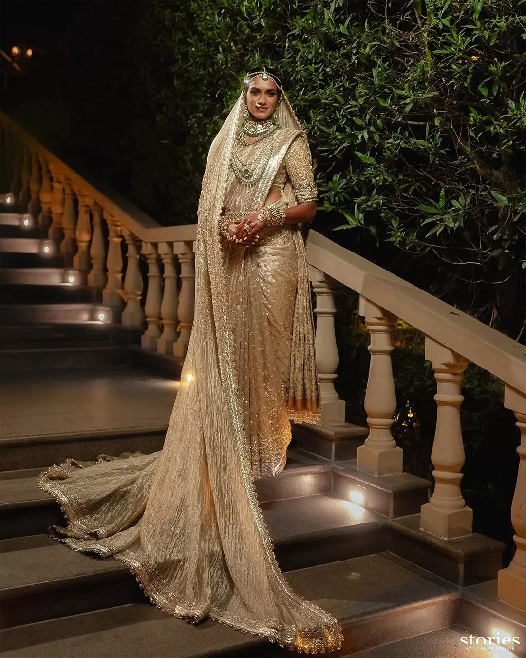 Manish Malhotra revealed details about PV Sindhu and Venkata Datta Sai's ivory-toned bridal outfits, which the couple wore with heirloom jewels. Sabyasachi Mukherjee designed their varmala outfits.