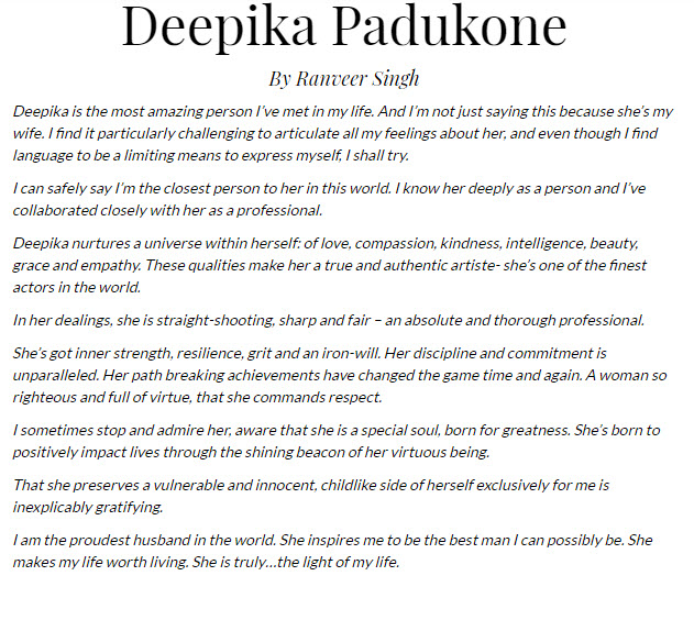 It could be further read as, “I can safely say I’m the closest person to her in this world. I know her deeply as a person and I’ve collaborated closely with her as a professional. Deepika nurtures a universe within herself: of love, compassion, kindness, intelligence, beauty, grace and empathy. These qualities make her a true and authentic artiste- she’s one of the finest actors in the world. In her dealings, she is straight-shooting, sharp and fair – an absolute and thorough professional. She’s got inner strength, resilience, grit and an iron-will. Her discipline and commitment is unparalleled. Her path breaking achievements have changed the game time and again. A woman so righteous and full of virtue, that she commands respect.”