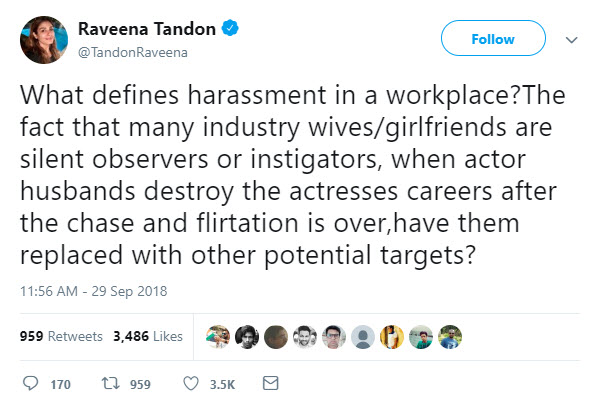 Raveena Tandon too, with a series of tweets, questioned the workplace harassments and expressed her strong opinion on the issue. Raveena, in one of her tweets, questioned the celeb wives who remain silent observers, while their husbands flirt with other actresses and destroy their careers. She wrote, "What defines harassment in a workplace? The fact that many industry wives/girlfriends are silent observers or instigators, when actor husbands destroy the actresses careers after the chase and flirtation is over, have them replaced with other potential targets?".