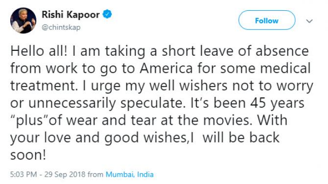 On September 29, 2018, Rishi Kapoor had taken to his Twitter handle and had tweeted about him jetting off to New York. The tweet had raised the speculations about his health. The news was ‘almost’ confirmed by Neetu Kapoor’s New Year 2019 wish on her Instagram handle. Her post had given us the confirmation about Rishi ji suffering from cancer. She had written, “Happy 2019 no resolutions only wishes this year!!! Less pollution traffic!! Hope in future cancer is only a zodiac sign!!! No hatred less poverty loads of love togetherness happiness n most imp. Good health.” (Recommended Read: Ileana D'Cruz's Cryptic Posts On Her Instagram Handle Sparks Rumours That All Is Not Well)