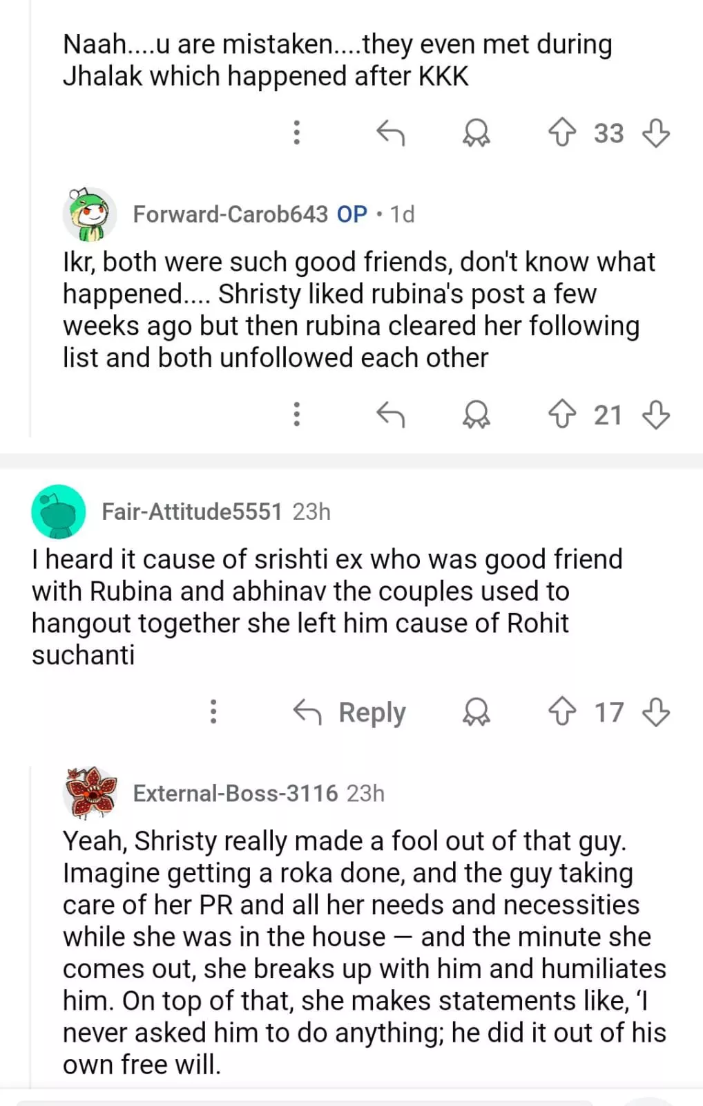 Rubina and Srishty's friendship dates back to the time when they were seen together on Zee's show, Choti Bahu. Over the years their friendship became very strong and it was evident via their social media handles. Apart from supporting each other even during their Bigg Boss days, it looks like now both of them reportedly are not on talking terms. A Redditor commented: