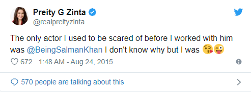 Preity has been friends with many of her peers from the industry and one amongst those is her Chori Chori Chupke Chupke, Har Dil Jo Pyaar Karega, Jaan-E-Mann, etc. co-star, Salman Khan. On August 24, 2015, Preity took to her official Twitter handle and dedicated a tweet to Salman, revealing the one actor she used to be scared of was him. The 44-year-old actress had tweeted, “The only actor I used to be scared of before I worked with him was @BeingSalmanKhan I don't know why but I was.” (You May Also Like: Arbaaz Khan Shares Son Arhaan Is Always In Contact With Him Post His Divorce With Malaika Arora)