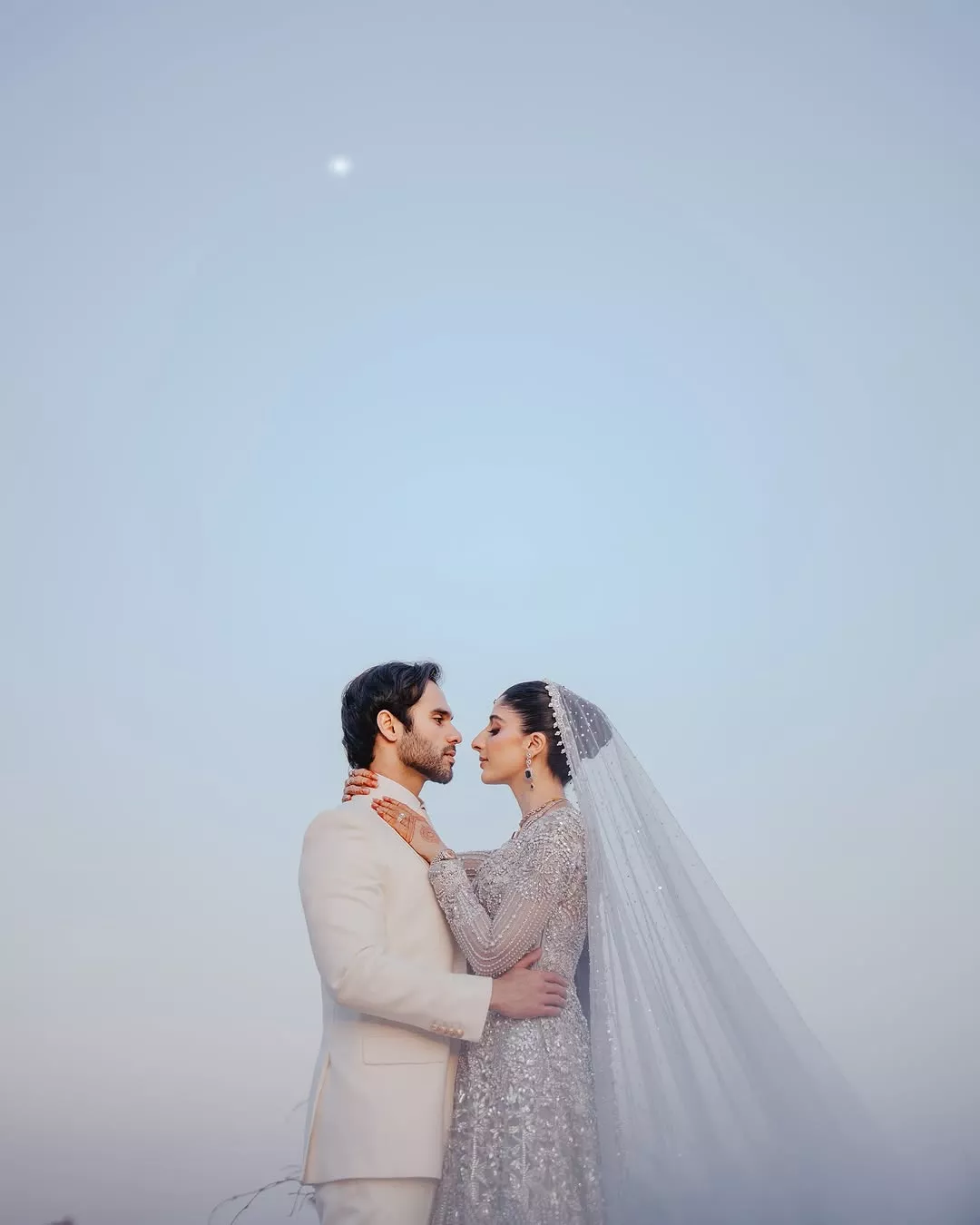For her walima, which is known to be a reception, Mawra Hocane was dolled up in an icy-blue toned lehenga from Zaha Couture. The dress had intricate work all over, following floral patterns and was embellished with silver-chrome accents. The dress featured artistry works such as tilla, gotta, kora dabka, and resham. Mawra teamed her lehenga with a hand-embellished zari net dupatta, and she looked simply gorgeous. Along with it, Mawra wore another sheen veil with pearl-studded borders.