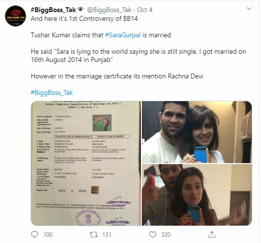 Punjabi singer and actress, Sara Gurpal had entered the show with her single relationship status. In a rather shocking revelation, her husband, Punjabi singer, Tushar Kumar had claimed that the two had gotten married in 2014, and she was lying about her marital status. He had also shared some pictures as proof of their marriage and the photo of the marriage certificate, in which, Sara Gurpal's name was mentioned as Rachna Devi.
