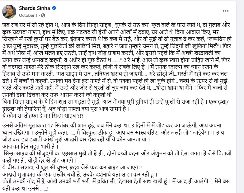 Sharda, on October 1, 2024, took to her Facebook handle, to remember how her husband, Brajikishore Sinha used to celebrate her birthday every year. It was on September 22, 2024, when she lost her husband and had her last meeting with him on September 17, 2024. Sharda's last words to her husband was, "Mai jaldi aaungi". A part of her long emotional note on FB read: