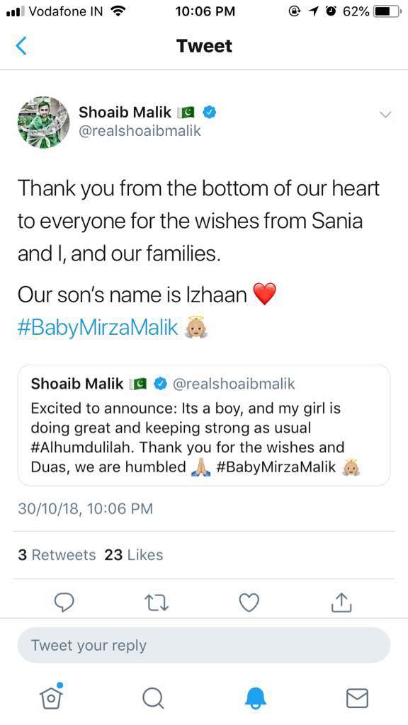 Shoaib announced on Twitter and tweeted, “Excited to announce: Its a boy, and my girl is doing great and keeping strong as usual #Alhumdulilah. Thank you for the wishes and Duas, we are humbled #BabyMirzaMalik”. And the excited khaala shared on Instagram a lovely caricature and captioned it, “It’s a boyyyy!!!! Alhamduilllllaaahhhh!!! @mirzasaniar @realshoaibmalik #babymirzamalik 30.10.18”. Shoaib has now finally announced the name of their little one. Announcing it on Twitter, Shoaib wrote, “Thank you from the bottom of our heart to everyone for the wishes from Sania and I, and our families. Our son’s name is Izhaan #BabyMirzaMalik”. Izhaan in Arabic means genius or obedience (to God).