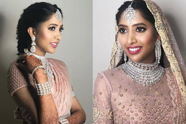 The bride later on, quickly changed into a different attire during her entry and jaimala. Shriya adorned a pastel pink coloured lehenga with 3/4th sleeves and a veil. This time, the newbie bride was again in diamond jewellery, but a different one! Her jaimala jewellery was diamond bangles unlike bracelets in the aforementioned look.