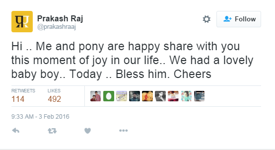 Actor Prakash Raj and his Bollywood choreographer wife, Pony Verma became parents to a healthy baby boy in February 2016. The three time National Film Award winning 50-year-old actor took to Twitter to announce the good news. (Read: Bollywood Celebrities Who Used Facebook And Twitter To Break Their Personal News)