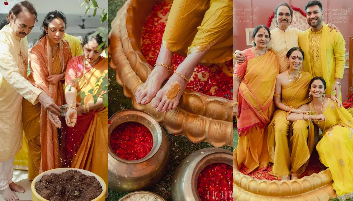 On November 29, 2024, Sobhita Dhulipala and Naga Chaitanya had their Mangalasnaanam ceremony, which is known as haldi. In some photos released by Vogue, Sobhita was seen decked up in a yellow-toned saree, and was seen performing the rituals. She wore a yellow saree and teamed it with an orange dupatta. She donned gold jewels and opted for soft-toned makeup with half-tied hairdo. Chaitanya wore a chikankari kurta.