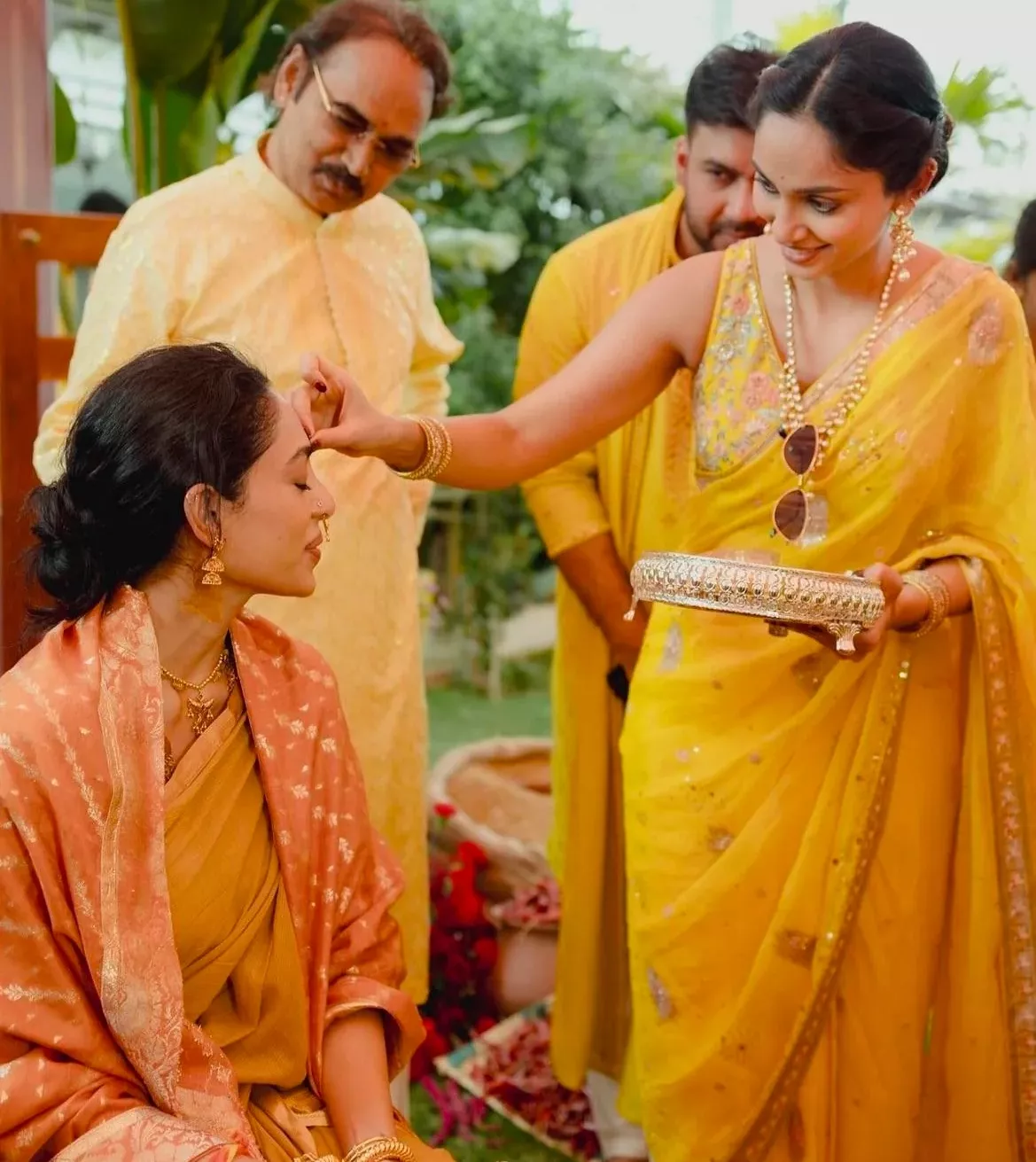 On November 29, 2024, Sobhita Dhulipala and Naga Chaitanya had their Mangalasnaanam ceremony, which is known as haldi. In some photos released by Vogue, Sobhita was seen decked up in a yellow-toned saree, and was seen performing the rituals. She wore a yellow saree and teamed it with an orange dupatta. She donned gold jewels and opted for soft-toned makeup with half-tied hairdo. Chaitanya wore a chikankari kurta.