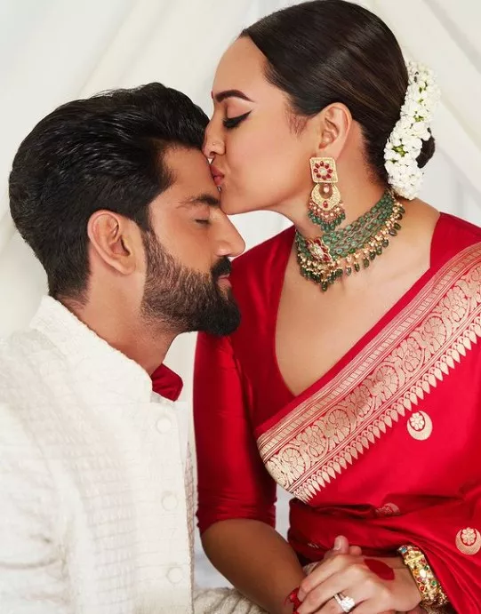Sonakshi Sinha and Zaheer Iqbal had a registry wedding on June 23, 2024, followed by a grand reception. Sonakshi turned into a minimal bride as she opted for a cream-hued chic saree with floral patterns embroidered in thread. She teamed her drape with a simple striped blouse. The bride wore a vintage necklace featuring precious gemstones and pearl drops, matching earrings, and a stack of bangles to complete her look. Subtle makeup, a bindi, and a white roses-adorned bun hairdo added stars to her bridal look.