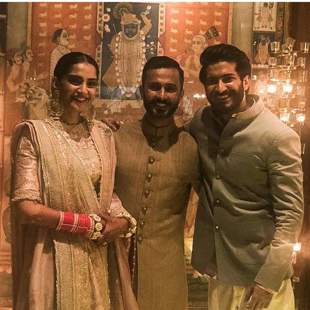 Sonam Kapoor and Anand Ahuja got married at a star-studded Sikh wedding today (May 08, 2018) in Mumbai. She looked beautiful in her red Anuradha Vakil lehenga which she teamed with a traditional and elegant chooda and jadau jewellery. A recent online portal also shared the diva’s first look after her wedding. Needless to say, Sonam slayed that as well! Checkout her picture with hubby Anand and little brother, Harshvardhan Kapoor.