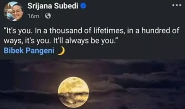 However, it was on December 19, 2024, when Bibek left the world, and Srijana's whole universe crashed down. Now, days after his demise, Srijana, for the first time, reacted to losing the love of her life forever. She took to her social media handle and shared a photo of a moon. Sharing the photo, she penned an emotional caption, wherein she wrote about how it has always been 'him' (Bibek) and how it will continue to be only him. She also tagged Bibek on the post, which surely left hearts feeling for her. She wrote: