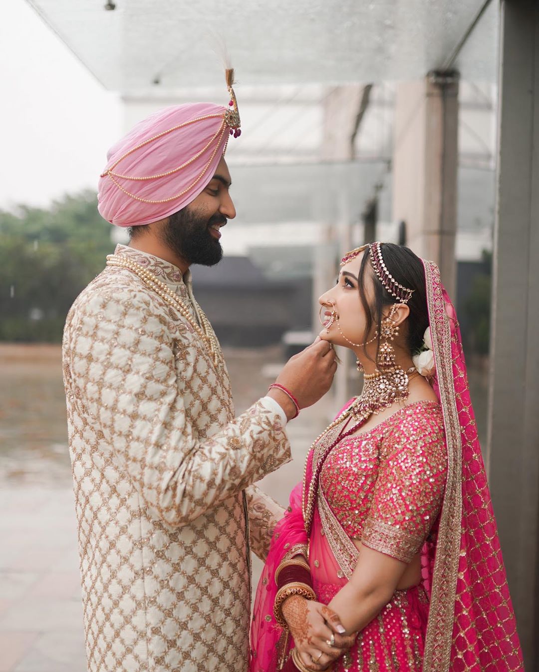 On the other hand, the groom had picked a cream-coloured sherwani with golden jaal-embroidery all over it. His look was accentuated with a string of pearl necklace and pink-turban. (Don't Miss: This Bride Flaunts White Mehendi On Her Wedding, Unique Boho Henna Design With Studs Is Showstopper)