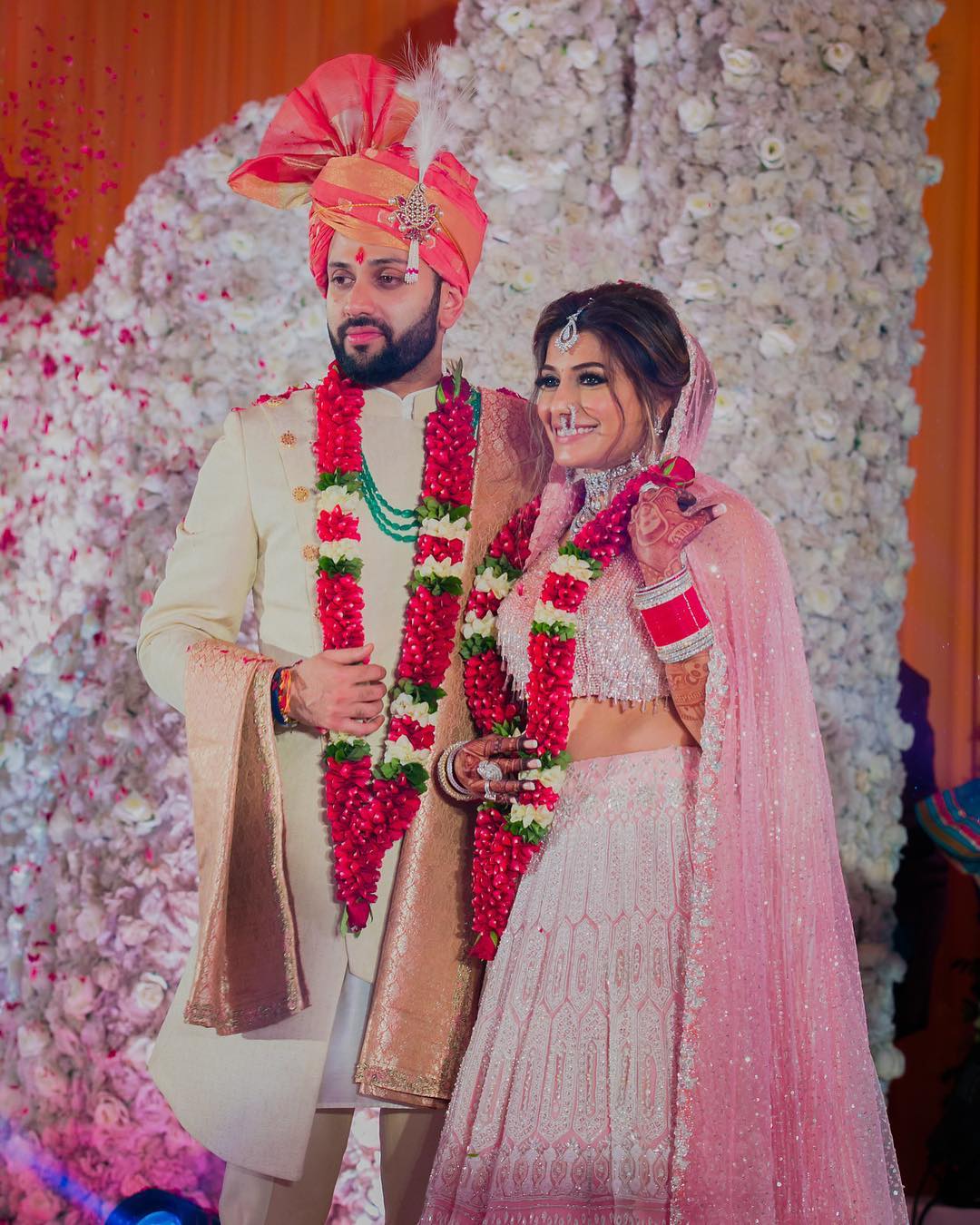 Silky wore a pretty pink lehenga for her wedding day from ace designer, Manish Malhotra. Her ensemble consisted of tassels, a sequinned, embellished-blouse and a matching skirt with pink and white hues. She accessorised her look with a diamond neckpiece, a nath and a maang teeka.