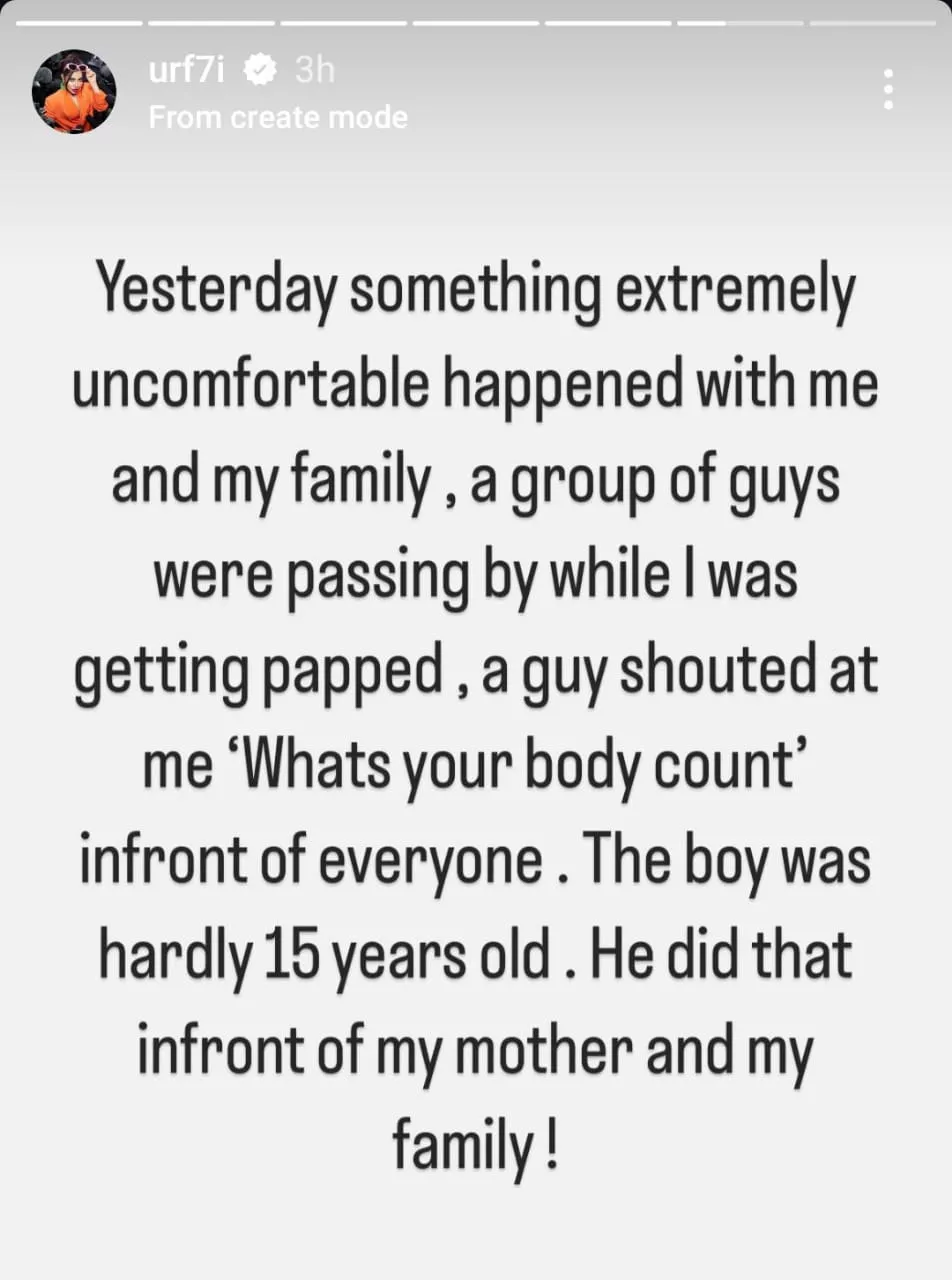 In a follow-up IG story, Uorfi Javed shared the clip, wherein she could be seen getting shocked hearing such a comment. The actress mentioned that she wanted to punch that boy, and asked everyone to teach their kids to respect women and others in general.