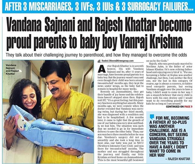 After 11 years of hardships wherein they suffered ‘three miscarriages, three IUI (Intrauterine Insemination) failures, three IVF (In Vitro Fertilisations) failures and three surrogacy failures’ and two-and-a-half months of ‘fight for life’ for their newborn kid in the NICU (Newborn Intensive Care Unit), Rajesh Khattar and Vandana Sajnani Khattar had taken their little bundle of joy, Vanraj Krishna Khattar home on August 24, 2019.
