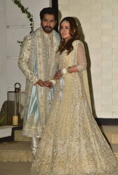 Talking about their wedding attire, then the lovely couple had ditched all the conventional colours and had looked stunning in their ivory-coloured outfits. The star wife, who is a designer herself, had donned an ivory-coloured lehenga with matching diamond jewellery. She had completed her look with subtle makeup and semi tied hair with flowers. Varun had twinned with his bride and had opted for an ivory-coloured sherwani with a silver-blue stole.