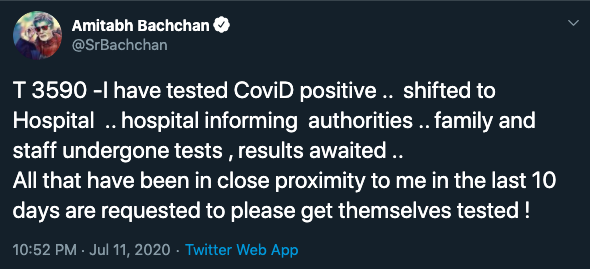 On July 11, 2020, Amitabh Bachchan had informed that he was tested positive and was admitted to Nanavati Hospital, Mumbai. Big B had tweeted, "I have tested COVID positive... shifted to Hospital, hospital informing authorities... family and staff undergone tests, results awaited. All that have been in close proximity to me in the last 10 days are requested to please get themselves tested!" Later, Abhishek Bachchan had informed that he was also tested positive with the virus and had mild symptoms. While everyone in the Bachchan household had gotten themselves tested, the reports of Jaya Bachchan came negative while Aishwarya Rai Bachchan and Aaradhya Bachchan tested positive in the second round.