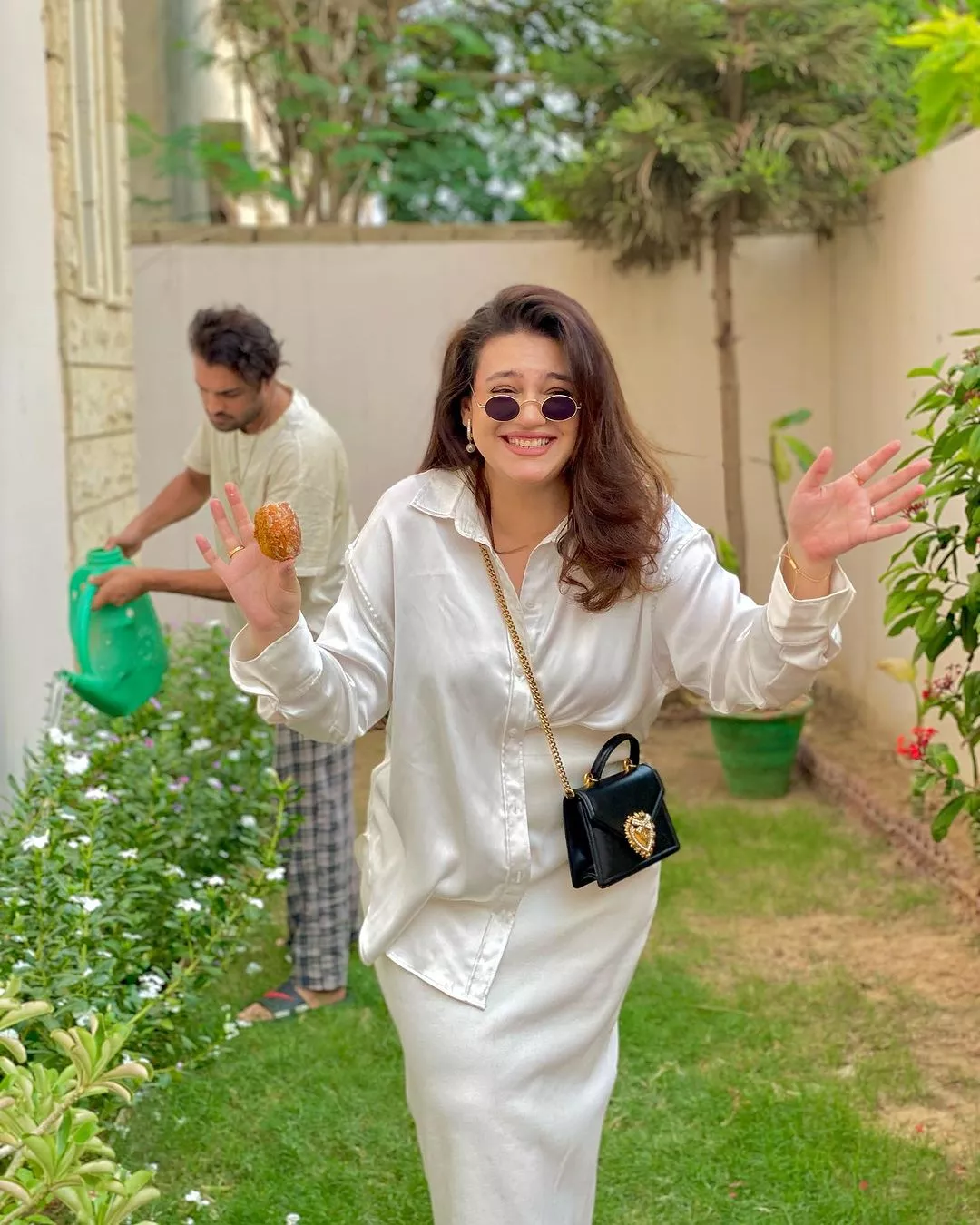On November 30, 2023, Zara Noor Abbas Siddiqui took to her Instagram handle and posted a picture, wherein she was seen donning a white-hued silk ensemble. In the photo, we can see her husband, Asad, watering the plants in the backdrop while Zara is striking a pose. The mommy-to-be was flaunting a pair of classy sunglasses and a black sling bag.