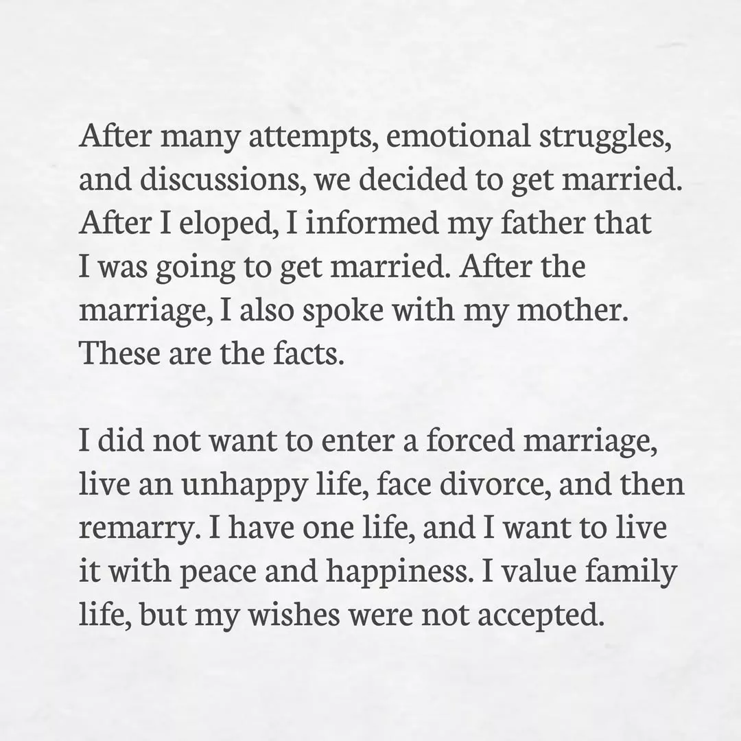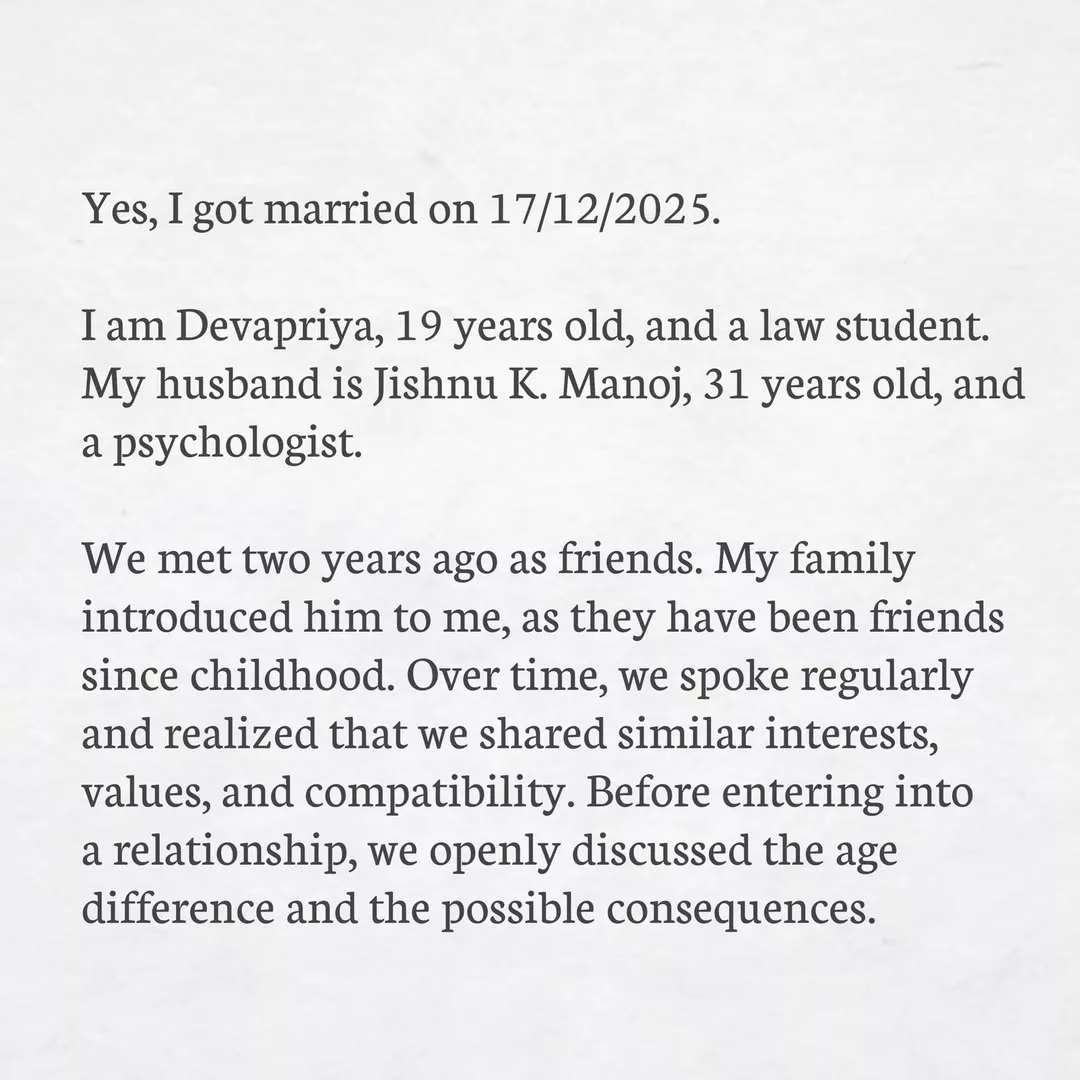 Taking to her Instagram handle, Devapriya made a new Instagram account and posted a picture note. She admitted that she got married on December 17, 2025, at the age of 19 while pursuing Law. She shared that her husband is a 31-year-old psychologist. She stated that they met two years ago, as their families were friends. She stated that their relationship was planned, and it grew on its own. They started dating after she turned an adult.