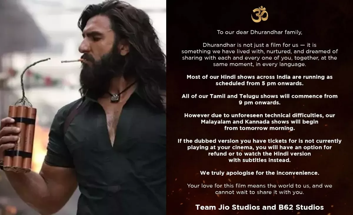 "To our dear Dhurandhar family, Dhurandhar is not just a film for us; it is something we have lived with, nurtured, and dreamed of sharing with each and every one of you, together, at the same moment, in every language. Most of our Hindi shows across India are running as scheduled from 5 pm onwards. All of our Tamil and Telugu shows will commence from 9 pm onwards. However, due to unforeseen technical difficulties, our Malayalam and Kannada shows will begin from tomorrow morning."