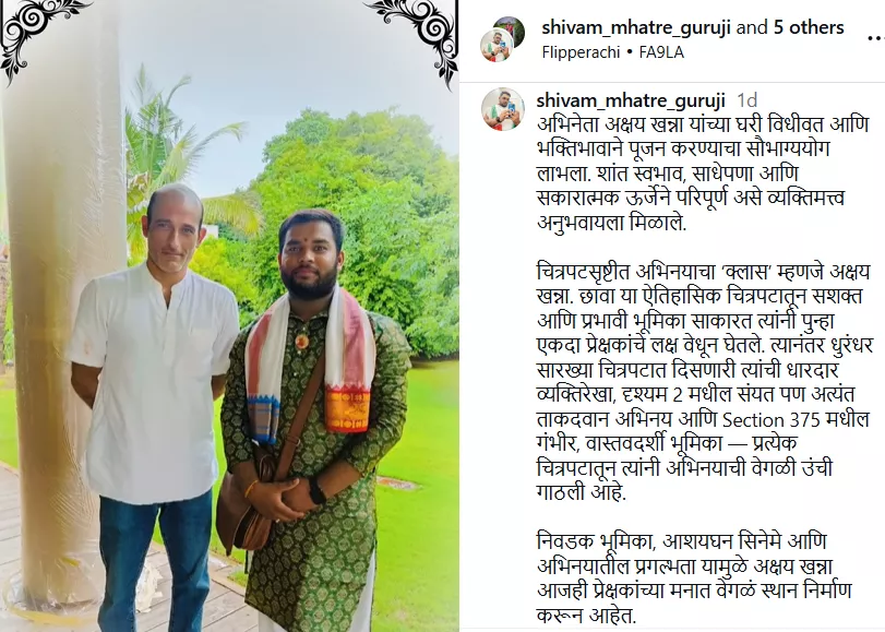 The priest shared the clip on his Instagram handle. In the video, Akshaye Khanna can be seen participating in the rituals alongside three priests. He is dressed casually in a white shirt paired with blue denim. Shivam wrote a lengthy note accompanying the video and stated that he performed a puja at the actor's residence. He added how the actor's "calm nature, simplicity, and positive energy" made the experience truly special. He further wrote: