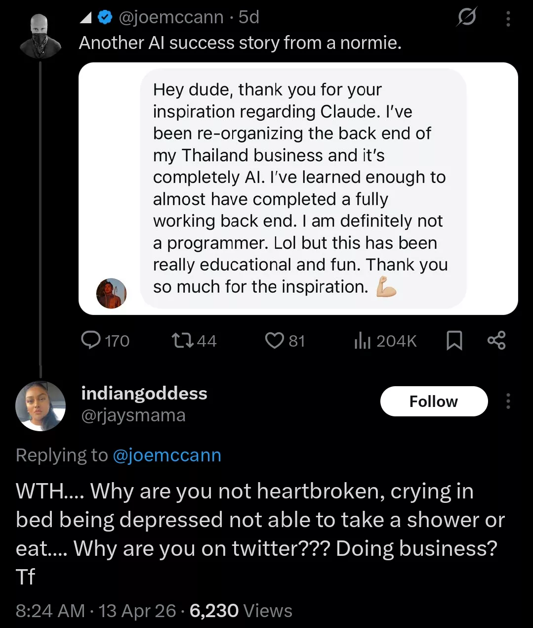Joe's last X post discussed an AI success story, in which a client thanked him for his help with their Thailand business. This post of Ashlee's fiancé sparked a hate train against him, with netizens expressing disbelief that he returned to his normal professional life so soon after such a big loss in his personal life. Many alleged that he wanted Ashlee dead and thus, the incident didn't affect him. One of the X users commented, "WTH.... Why are you not heartbroken, crying in bed being depressed not able to take a shower or eat.... Why are you on twitter??? Doing business?"