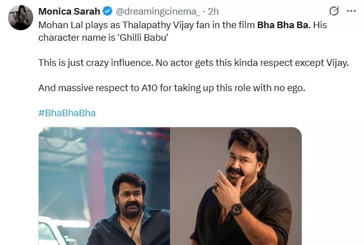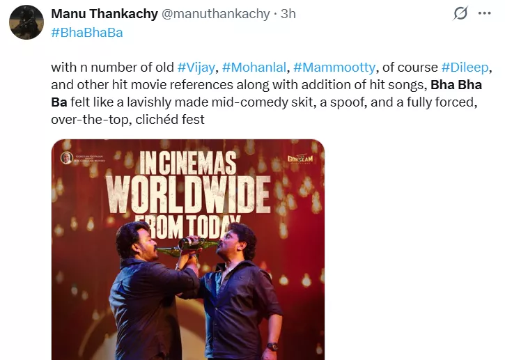 References and spoof moments win hearts. Netizens are enjoying the many references and spoof scenes in the film. One tweet said, "No logic only madness… spoof reference… Retro song fight sequence was a level experience." A comment read, "with n number of old #Vijay, #Mohanlal, #Mammootty, of course #Dileep, and other hit movie references along with addition of hit songs, Bha Bha Ba felt like a lavishly made mid-comedy skit, a spoof, and a fully forced, over-the-top, clichéd fest."