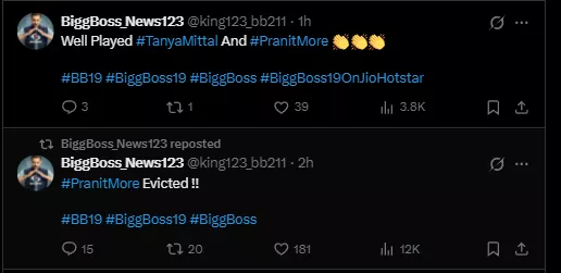 As per social media posts by Bigg Boss' fan page, they congratulated Pranit More and Tanya Mittal on their journey. The posts show that the two are out of the race of lifting the Bigg Boss 19 trophy, and if the reports are true, then the top three contestants are Gaurav Khanna, Farrhana Bhatt, and Amaal Malik. It is worth mentioning that Malti Chahar got eliminated from the show in a mid-week vote-out.