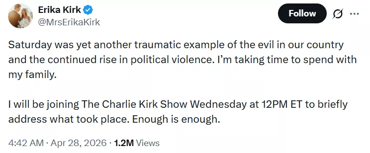 Soon after, a video of the Turning Point USA CEO, Erika Krik, went viral online, showing her in tears amid the events at the White House Correspondents' Dinner. Now, almost two days later, on April 27, 2026 (ET), Erika took to her X account and broke the silence on the matter. She shared how the incident was another example of the political violence that has been on the rise in the United States. She added that she would be taking some time now to be with her family. However, she also assured her well-wishers that she will be back on The Charlie Kirk Show on April 29, 2026. She ended the note with a strong message and was quoted as saying: