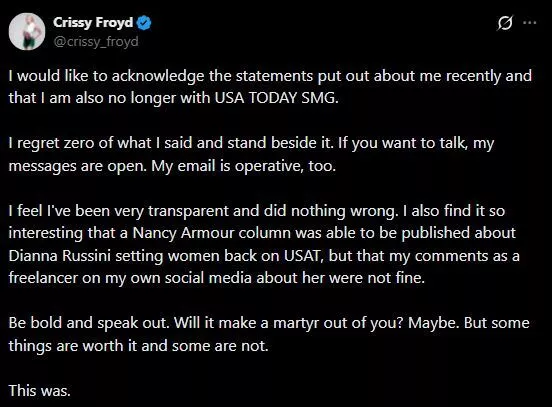 What do you think about Cirssy Froyd's comments after being fired from USA Today?