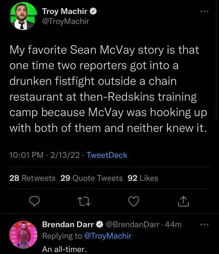 An X (formerly Twitter) user shared that the Dianna vs Britt rumour was their favourite Sean McVay story. They wrote, "My favorite Sean McVay story is that one time two reporters got into a drunken fistfight outside a chain restaurant at then-Redskins training camp because McVay was hooking up with both of them and neither knew it." Another commented on the post, sarcastically calling Dianna "An all-time", which most probably means alleging her of having multiple partners at the same time. Notably, neither of the people involved in the issue shared any official statement regarding the speculations. The rumours first surfaced amid Dianna's link-up with Scot McCloughan.