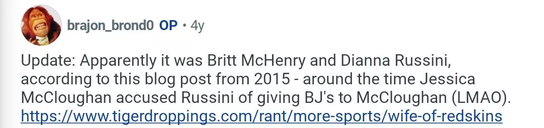 However, Jessica McCloughan later admitted she misunderstood Dianna and Scot's relationship and apologised for defaming her. She mentioned that the affair accusations were "unfounded and inappropriate" and regretted that her comments had brought "undeserved negative attention" to Dianna and Redskins. She also apologised to the team and its fanbase, and later deleted her Twitter account. Jessica's statements resurfaced amid Dianna's affair buzz with Mike Vrabel.