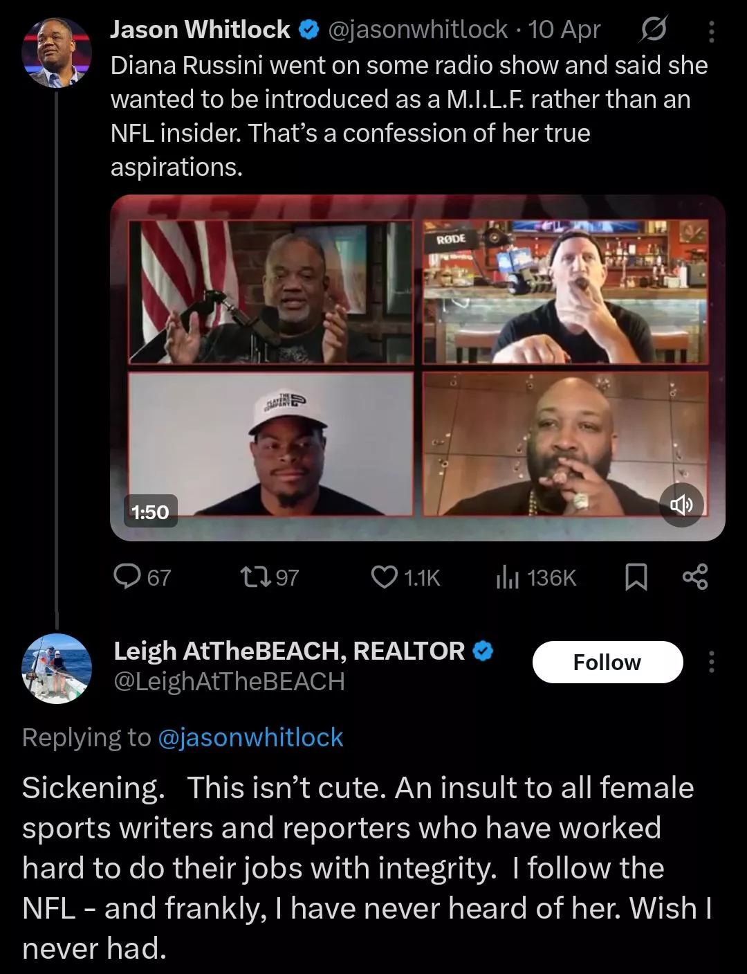 "Now, that's a confession. Any woman that's going on a radio broadcast and saying, "Hey, don't call me an NFL insider. Don't call me this. Call me M*LF' She's confessing."