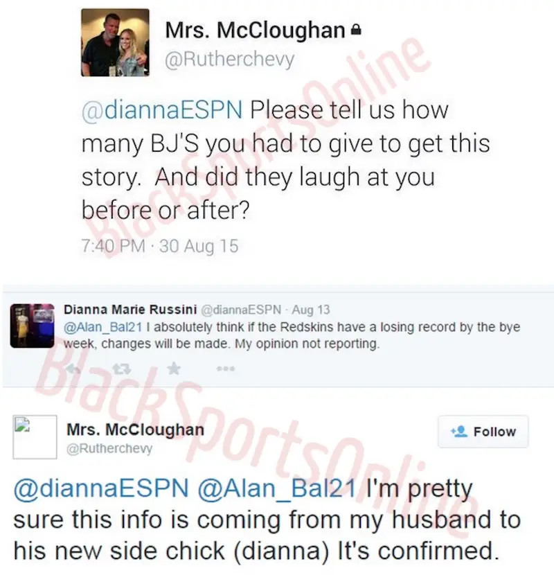 It was in 2015, when Dianna Russini's name was dragged by Jessica McCloughan, the wife of Washington Redskins then-general manager, Scot McCloughan. She made a serious accusation on Twitter against Dianna, who was then working for ESPN. The wife of the then-GM claimed that Dianna was getting inside information due to her affair with her husband. She even went on to claim that Dianna was her husband's side chick.