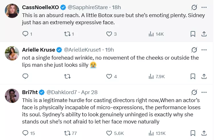"This is a legitimate hurdle for casting directors right now. When an actor’s face is physically incapable of micro-expressions, the performance loses its soul. Sydney’s ability to look genuinely unhinged is exactly why she stands out. She’s not afraid to let her face move naturally"