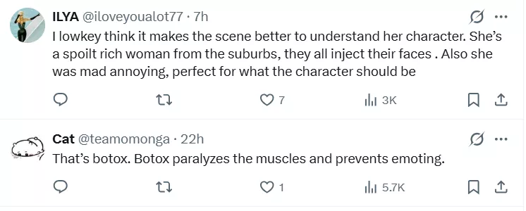 Nonetheless, some users disagreed about botox use and penned, "I lowkey think it makes the scene better to understand her character. She’s a spoilt rich woman from the suburbs, and they all inject their faces. Also, she was mad annoying, perfect for what the character should be." Another wrote, "Idc if u guys hate her or not, but she really ate with her acting every single scene in that show, she really did deliver."