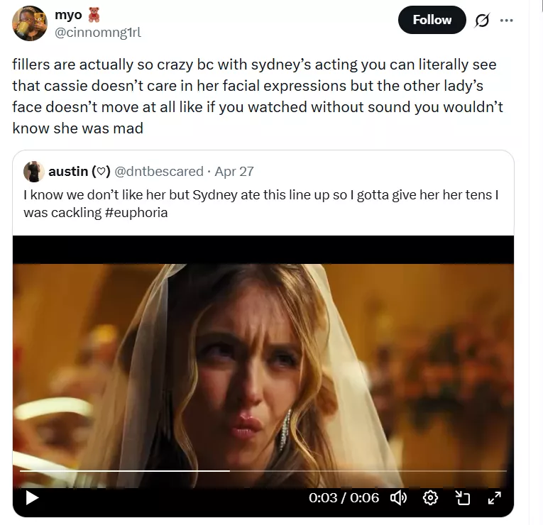 A comment read, "Definitelyyy noticed that. Glad someone pointed it out." A user penned, "Omg that's a HUGE difference." A user wrote, "The woman's face was motionless and expressionless, with no emotion at all due to Botox vs the clear expressions on Sydney's face."It’s funny because the scene felt off, but at the same time, I didn’t know why since Sydney Sweeney’s acting was phenomenal. Thanks to Twitter, now it makes sense what was throwing it off; it was Cassie’s friend." A user in a long note wrote: