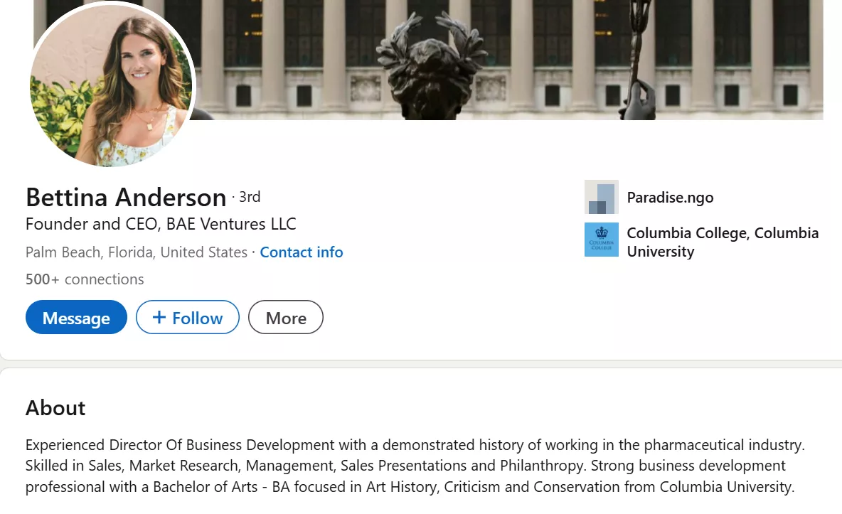 Speaking of Bettina's mom, Inger Anderson, she has been a famous philanthropist in the business circle. She owns the Palm Beach Groves which is an orange orchard that her late husband had purchased back in 1978. Inger has been active in business and in charitable initiatives, and she spent her childhood at a Palm Beach property called Oasis Cottage. Speaking of Bettina, a part of her LinkedIn Bio reads: