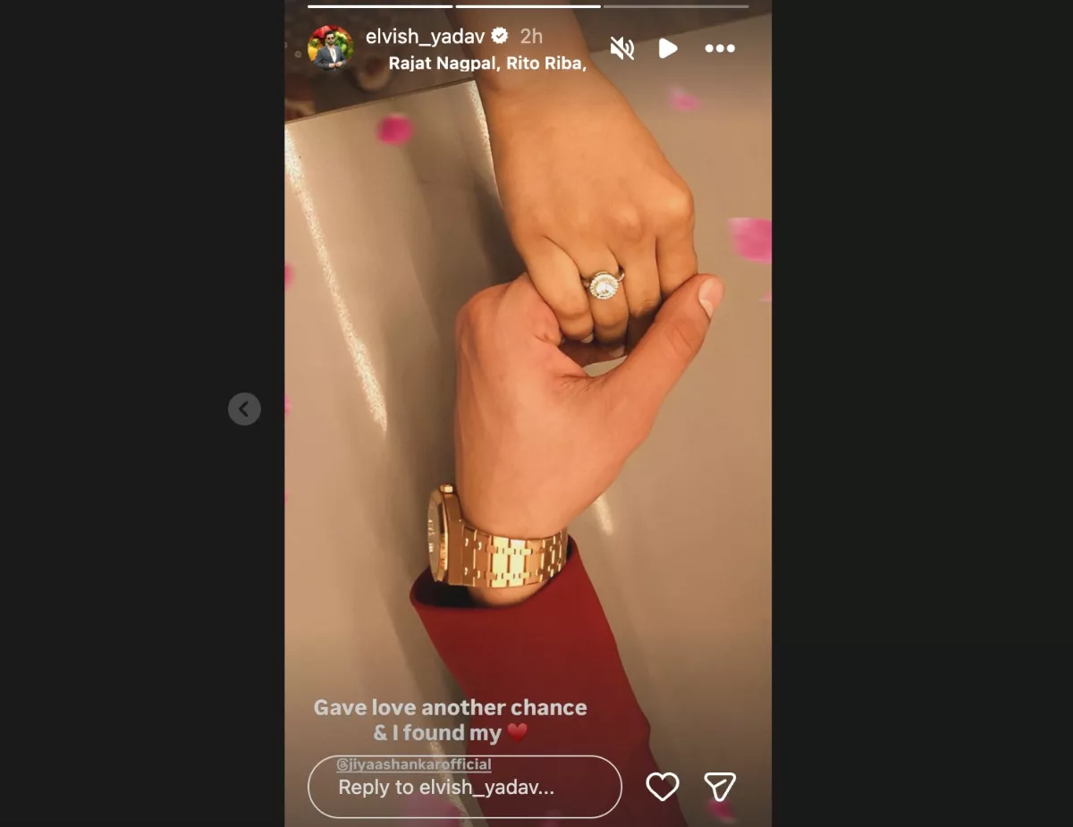 Taking to his Instagram stories, Elvish left his fans jaw-dropped and many girls heartbroken as he announced his love for Jiya Shankar. He shared a picture while holding Jiya's hand. However, it was her huge diamond ring that seems to be given by Elvish. Along with it, he penned: