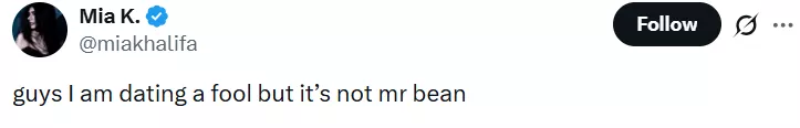 Mia Khalifa took to her X handle (formerly Twitter) and put an end to the speculations that have left the internet abuzz. The 33-year-old former adult film star clarified the situation. Mia admitted that she was dating someone. However, very clearly confirmed that it wasn't Rowan Atkinson. This remark highlights her ongoing discretion regarding her current partner, whose identity remains private. She was quoted as saying:
