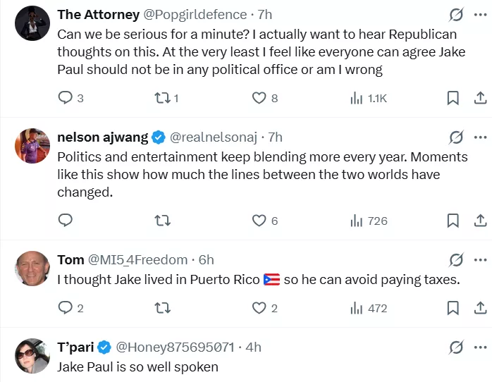 The internet has had some strong opinions about Jake Paul's presence at US President Donald Trump's rally. While some users felt like it was a heavy statement, others didn't welcome the statement with the same zeal. A user penned, "First Erika Kirk…now Jake Paul…we are not a serious country." Another wrote, "Voting is so easy for me. I just vote for whoever Trump endorses. I dont even have to think." A user commented, "Politics and entertainment keep blending more every year. Moments like this show how much the lines between the two worlds have changed."