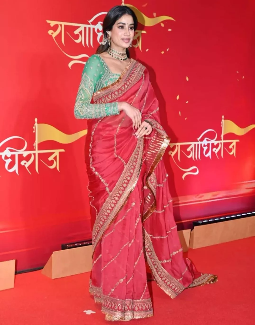 Janhvi Kapoor recently attended the premiere of the musical, Rajadhiraaj: Love Life Leela at NMACC. For the occasion, she looked breathtaking in a red saree from the shelves of ace designer, Torani. The vibrant red hue of her saree was beautifully complemented by a contrasting green-toned blouse. Moreover, the entire ensemble featured intricate golden embroidery.