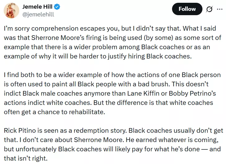 Hours later, Jemele Hill took to her X account and shared a long note clarifying her statement on Sherrone Moore. She shared that the incident with Moore was being used as some sort of "example that there is a wider problem among Black coaches." She further revealed that her statement was meant to raise awareness that Moore's actions can further make hiring Black coaches more difficult. She added: