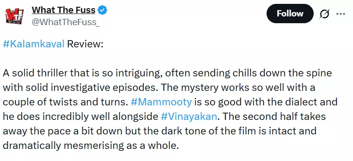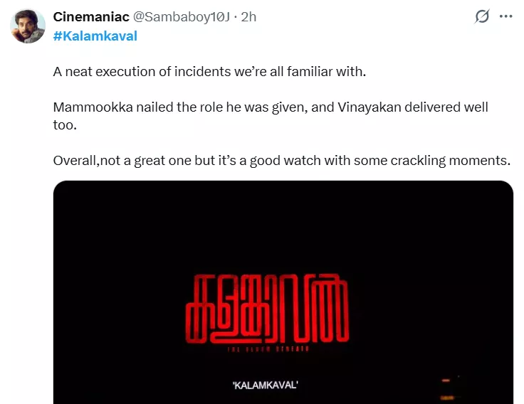 With Kalamkaval now playing in cinemas, X (formerly Twitter) has been flooded with audience sharing their views. The film had already generated online discussion even before its release, and as more shows are screened, additional reactions are expected over the coming hours and days. A user was quoted as saying, "Watched #KalamKaval Usual Cat & Mouse Thriller, which highly relies on #Mammootty's performance. Vinayakan miscast. Gripping only at parts. Superb BGM. Poor Visuals. Non-linear editing is good at parts, but the overuse of intercuts in the 2nd half was unnecessary. ABOVE AVERAGE 2.75/5."
