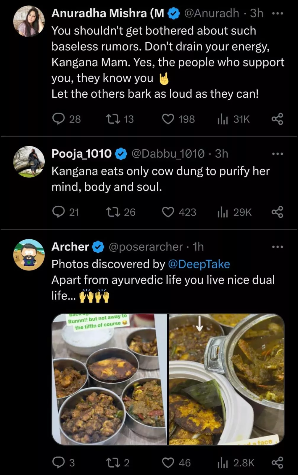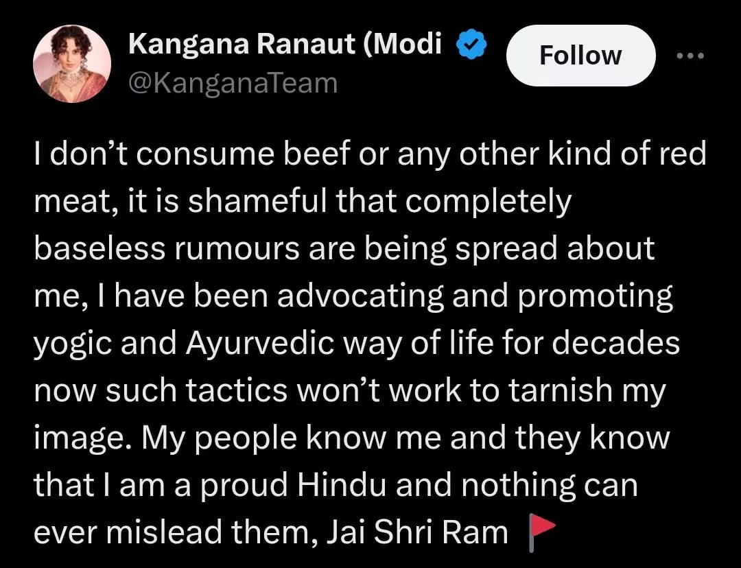 Taking to her X handle, Kangana Ranaut penned a note dismissing rumours about her eating 'beef'. She mentioned that all such rumours that talk about the same are baseless, and she has been promoting Yogic and Ayurvedic ways of life for a long amount of time. Thus, those who spread such rumours are simply doing this in order to tarnish her image. With this tweet of hers, she also proved herself to be a true sanatani who doesn't believe in the consumption of red meat. Kangana wrote: