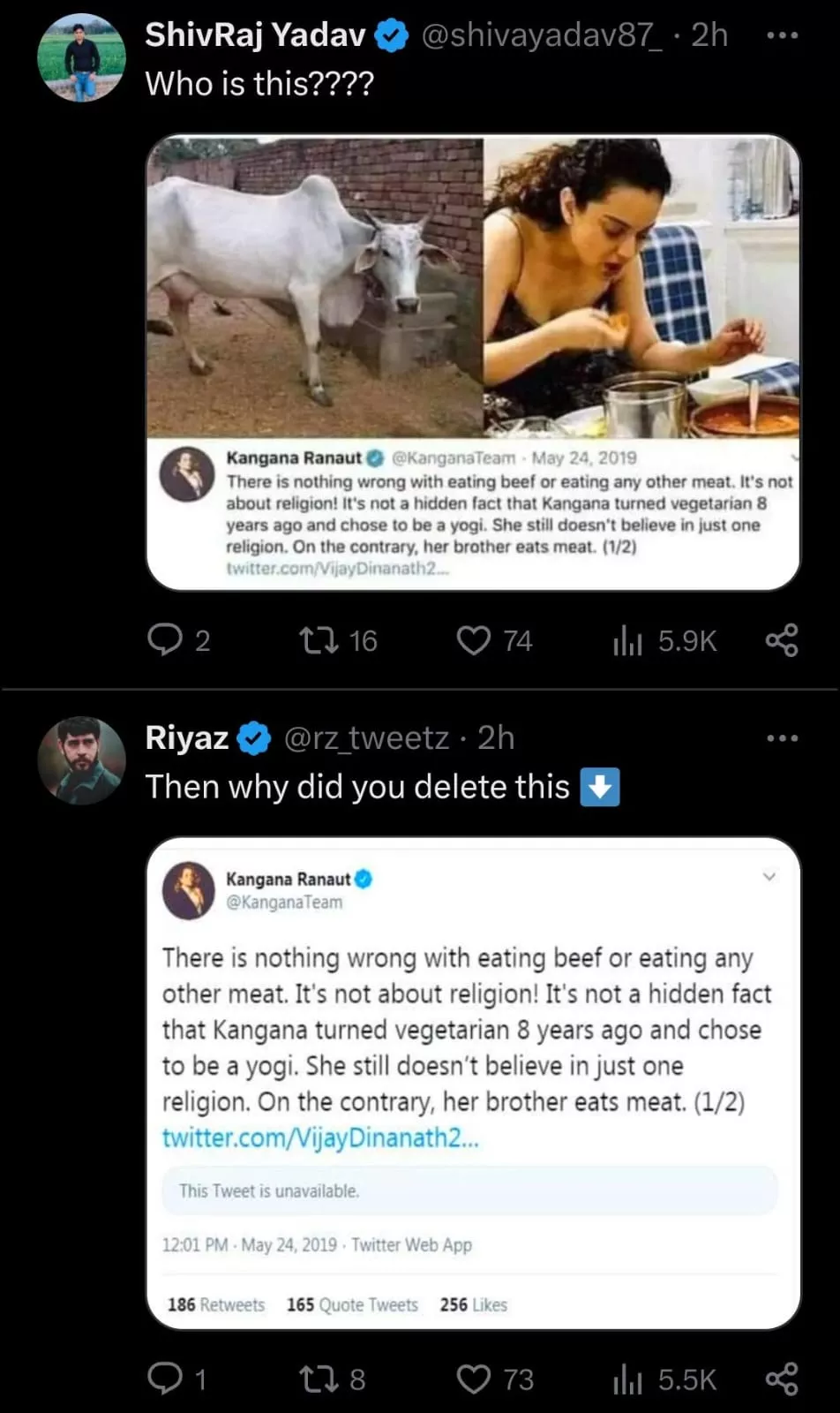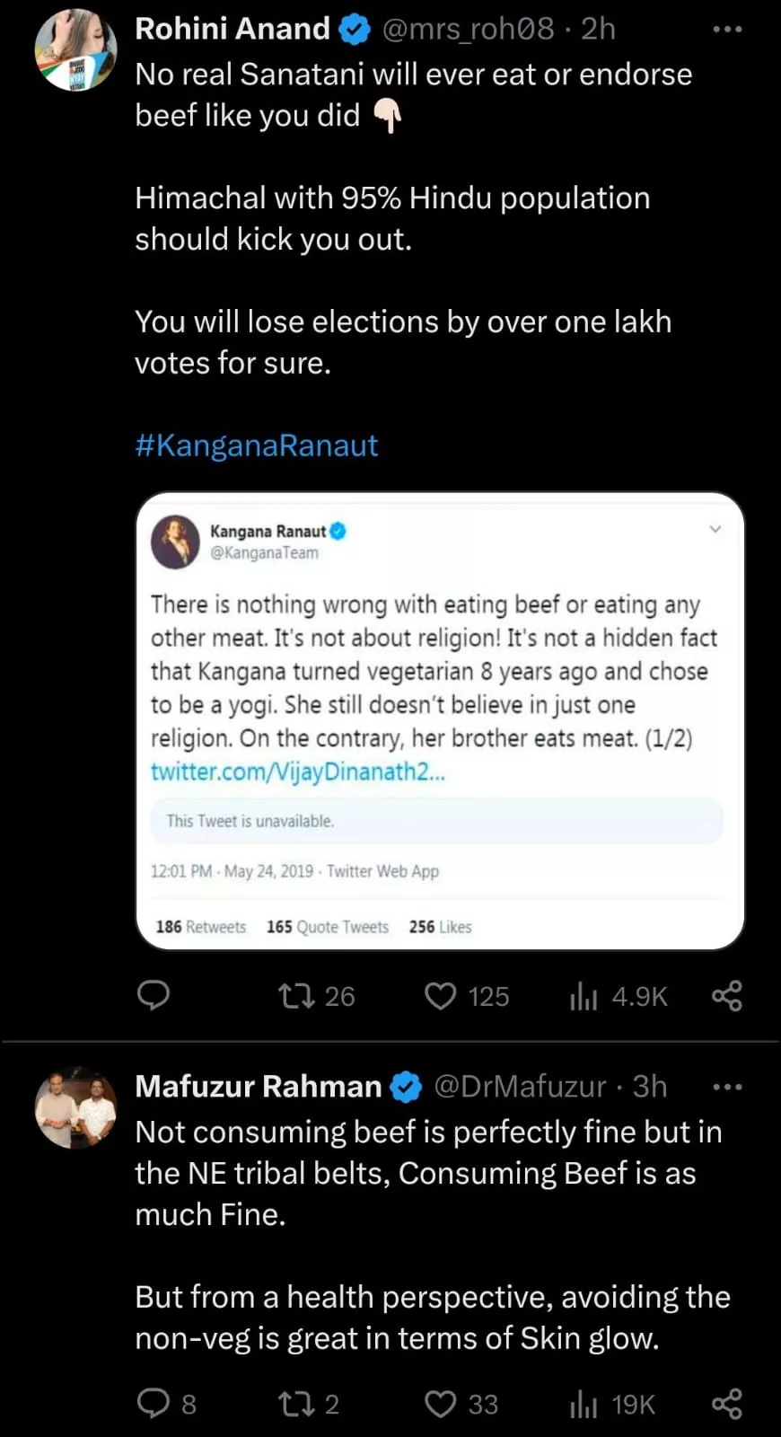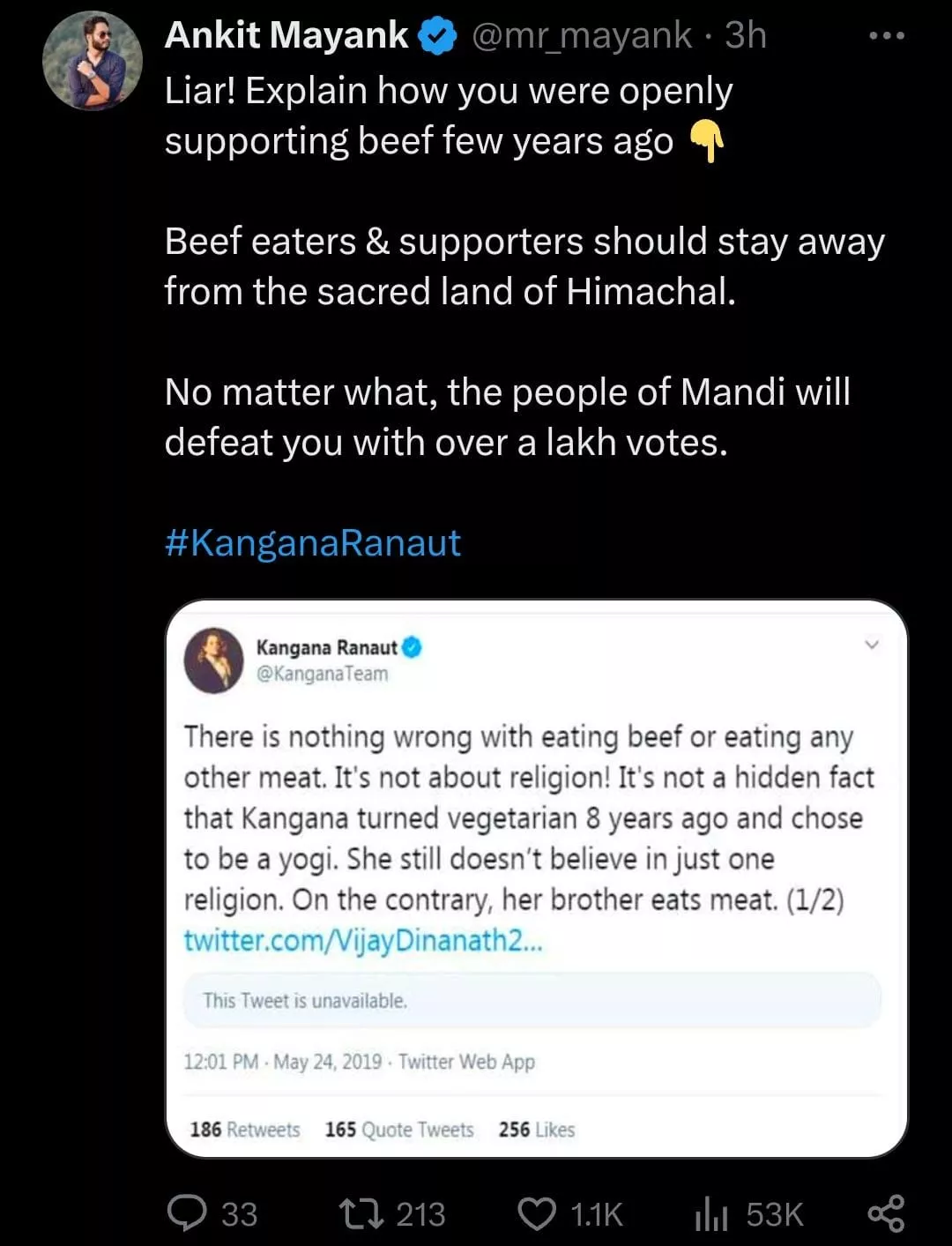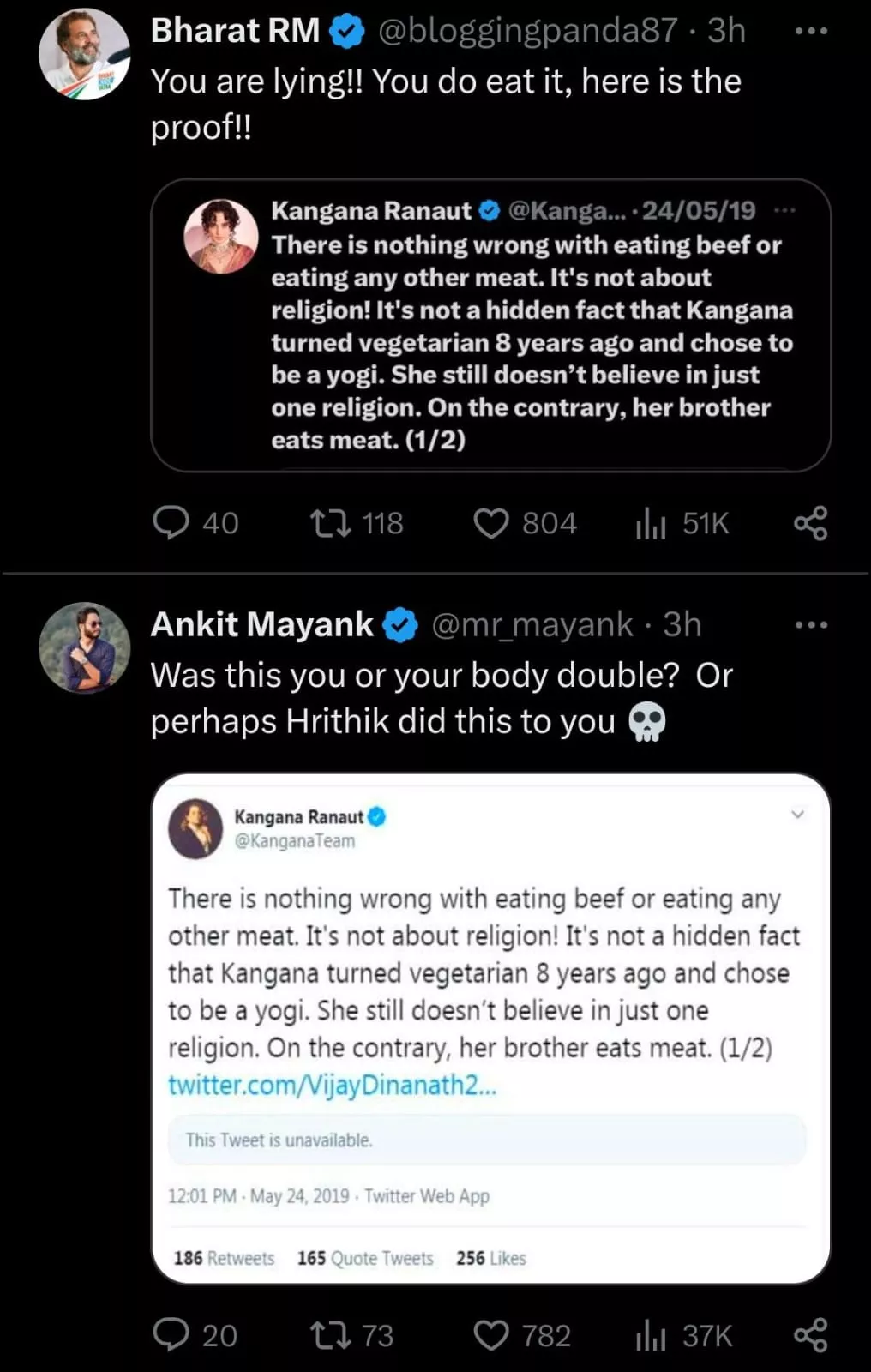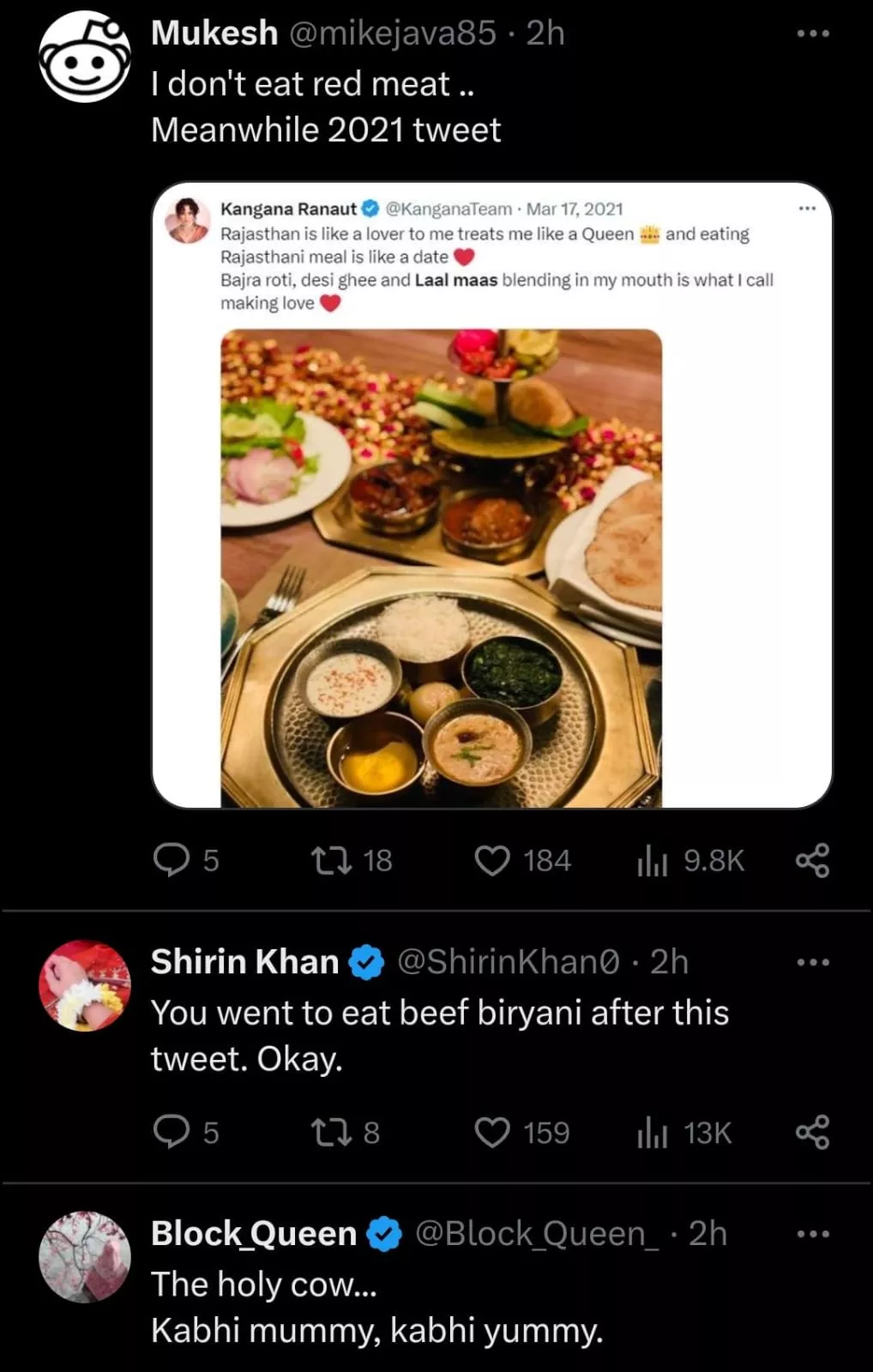 But as soon as Kangana's tweet surfaced on the internet, netizens rushed to the comment section to react to the same. Some social media users also dug out an old tweet from 2019, in which she had written, “There is nothing wrong with eating beef or eating any other meat. It's not about religion! It's not a hidden fact that Kangana turned vegetarian 8 years ago and chose to be a yogi. She still doesn't believe in just one religion. On the contrary, her brother eats meat.” Thus, they called her a liar and mentioned that, in reality, she does the exact opposite by consuming red meat. However, some fans also supported her by saying that she did nothing wrong.