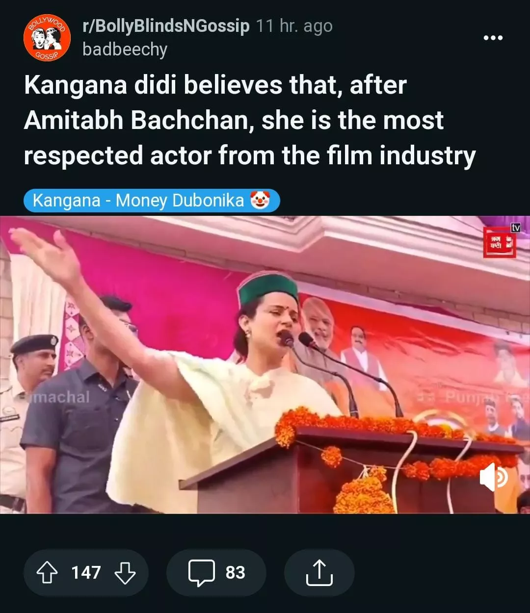 Now, a video of Kangana Ranaut went viral on social media, wherein she was seen giving a speech at one of the rallies for her party. However, during her speech, she made a comparison between herself and Amitabh Bachchan. She mentioned that after Amitabh, if there is any actor in the industry who gets such love and respect in the industry, it is her. She shared: