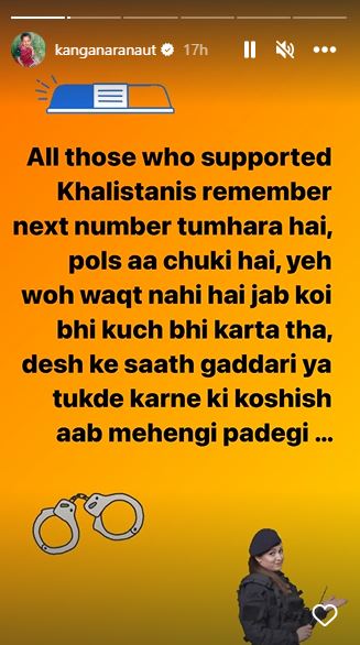"All those who supported Khalistanis remember next number tumhara hai, pols aa chuki hain, yeh who waqt nahin hain, jab koi bhi kuch bhi karta tha, desh ke saath gaddari ya tukde karne ki koshish aab mehengi padegi."